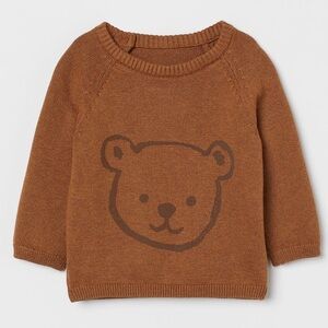 This H&M Toddler Camel Knit Teddy Bear Sweater is available in 18 Months. Fine-knit sweater in soft cotton. Long raglan sleeves, buttons on one shoulder, and ribbing at neckline, cuffs, and hem. It's in great condition and still has a lot of wear left on it.