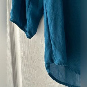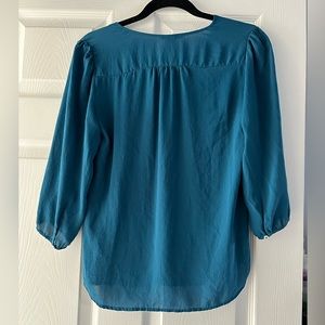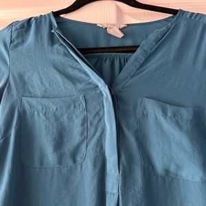 H&M half button down shirt, with 3/4 sleeves. Beautiful blue teal color. Very light fabric that makes it flowy and wears very nicely! Or looks great tucked in and dressed up for work. Because the fabric is thin there are a couple threads showing on the seams, but still in tact and has lots of life left. Says size 8 but fits like a normal size Small.