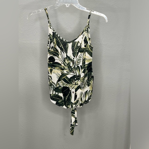 H&M white button up top with green palm leaves on it, top ties at the bottom. Perfect for your next beach vacation Size: 2 but fits loose