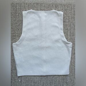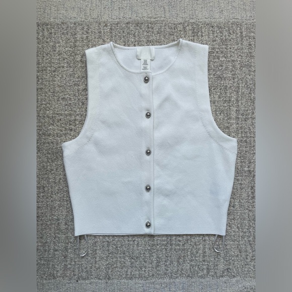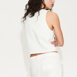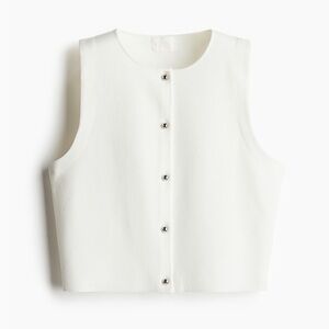 Elegant sleeveless top. Features button-up front. Perfect for layering.