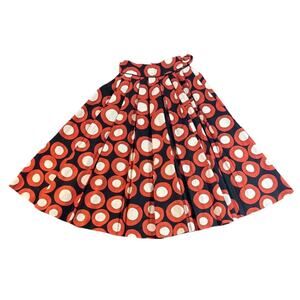 The H&M Tribute to Marimekko Full Pleated Skirt in size 4 is a stylish and colorful piece perfect for various occasions like parties, cocktails, or business events. This long skirt features a geometric pattern in black, orange, and off-white colors, with buttons, snaps, and zipper closure. Made of cotton tweed fabric, this designer collaboration skirt from H&M also includes pleats and pockets, making it a versatile and trendy addition to any woman's wardrobe.