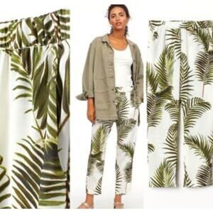These H&M tropical palm leaf print pants are size XS. The trousers feature a pull-on style in an ivory, white, and green colorway. The lightweight and breathable polyester crepe fabric makes them suitable for travel, parties, casual outings, formal events, workwear, and business meetings. Features: - High-rise - Tapered leg - Ankle length #tropical #palmtree #crepepants