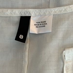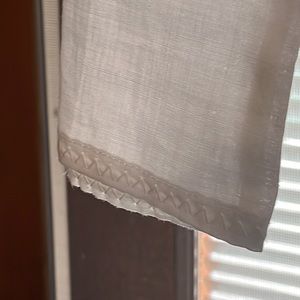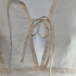 Slightly Off-white tunic. V-neck with option to tie across V. (Picture shows bottom ribbon in bow with top ribbon left to hang open). Zig-zag detail at wrist and long bottom hem.