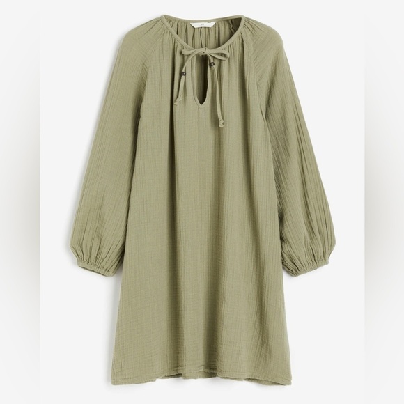 H&M Tunic Dress, Khaki Green, 100% Cotton Long Sleeve Shirt Dress, Size XS
