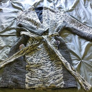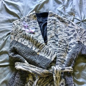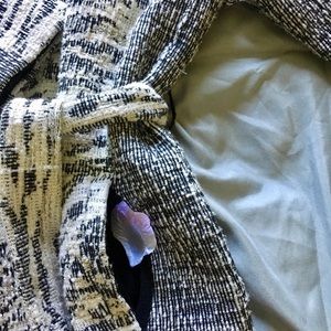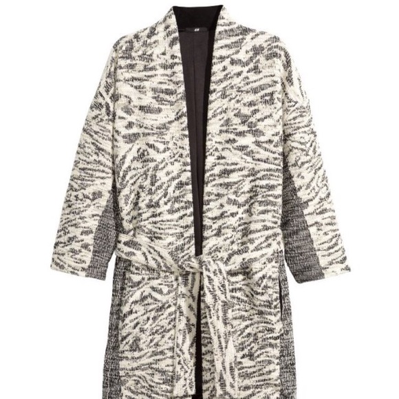 H&M lightweight jacket with tie closure. Black, white/cream, and subtle metallic threads. Black lining. 3/4 length sleeves. Size XS but could also fit a size S. Great transition coat into warmer or cooler weather. Worn only once. Excellent condition. Gorgeous and really chic!