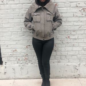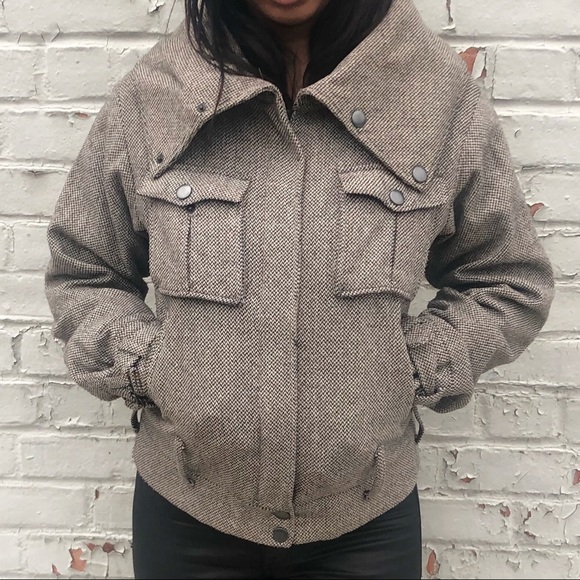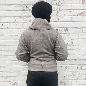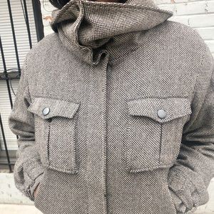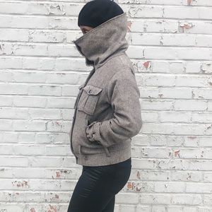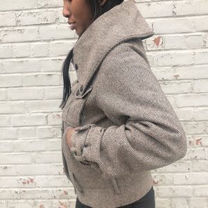 A tweed-style jacket by H&M. Wool/poly blend. High fold-over neck that can be worn in many ways, snap button closure & zipper. Boho-vibes and very stylist.