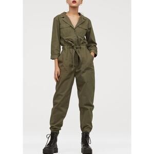 H&M Twill Jumpsuit for Women Size 6 – Green 3/4 Sleeve Button-Front Belted Overalls, Utility-Inspired One-Piece for Workwear, Travel, or Everyday Style