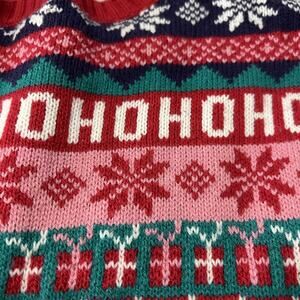 Design details: Crewneck, long sleeves, ribbed collar/cuffs/hem, "HOHOHO" text, "LOL" with cat faces, snowflakes, candy canes, gift boxes, and geometric knit bands.