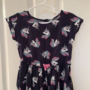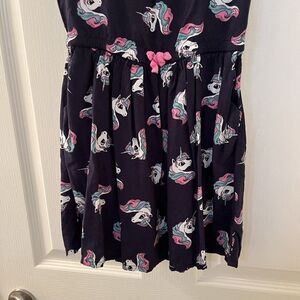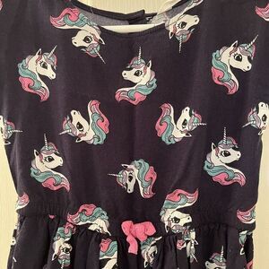 H&M Unicorn Dress Navy Blue Pockets Girls Size 4-5 years. We loved this dress, lightweight and so cute on. Pockets and an elastic waist with a bow. Cuffed sleeves. Has been worn and washed, the bow is all wrinkled up and maybe some slight wash wear, but nothing major. Good Used Condition.