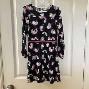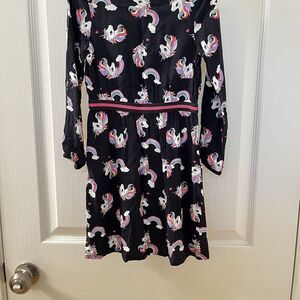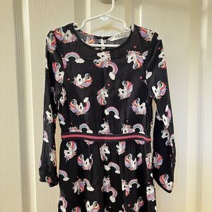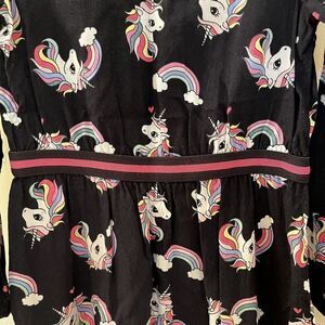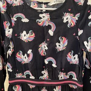 H&M Unicorn and Rainbow Dress Black Long Sleeve Elastic Waist Girls Size 5-6 years. Such an adorable dress. Has been worn and washed, wrinkled from being washed, and maybe some slight wash wear and fade because of the black, but no other issues that I can find. Very Good Used Condition. A printed unicorns and rainbows pattern dress. Round neckline and an opening with a button on the back. Long sleeves with elastic cuffs. Visible elastic waistband with a pink stripe around it and gathered flared skirt.