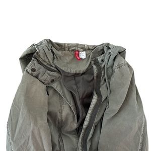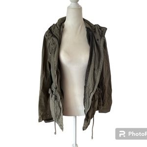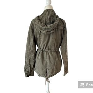 Green jacket. Can cinch the waist. Can cinch the bottom too. 3 front pockets. Zip and snap button closure. Shell 100% Cotton. Lining 100% Polyester.