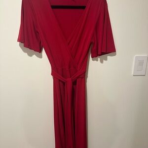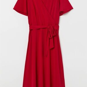 Calf-length, short-sleeved wrap dress made of soft crepe jersey. It features a V-neck, wide sleeves, and a sewn-on tie belt that can be wrapped around the waist multiple times. Unlined. Worn once