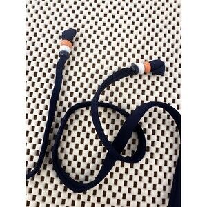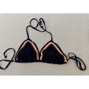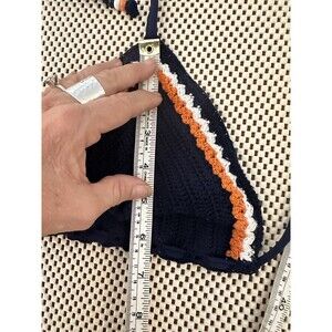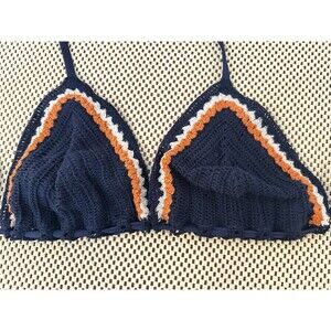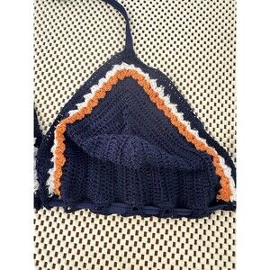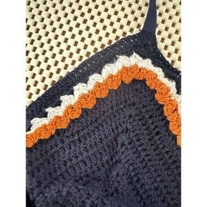 Super cute super sexy halter top by H&M. Although this describes as a bikini top, I believe it works better as just a halter top. Crocheted yarn. Lined. String tie closure at neck and back. This one screams 70s fives! Navy blue with orange and white accents.