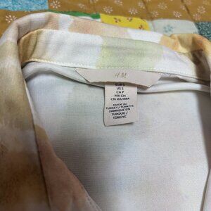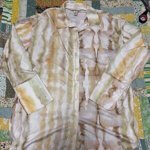 This is a size S, but I am usually a size 10 and it fits me. It’s an oversized blouse. 100% Polyester. Blouse length from top to bottom 31 in, so fits like a tunic