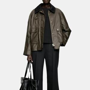 H&M Waxed Jacket Car Coat Barn Olive Khaki Green Brown Corduroy Collar small