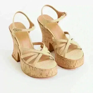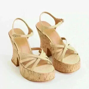 Platform Wedge Sandals featuring crossover foot straps and an adjustable ankle strap with a metal buckle. Cork soles.