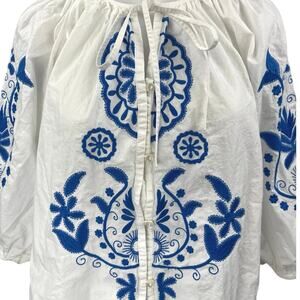 H&M White Blue Floral Paisley Embroidered Half Sleeve Button Down Blouse Top L