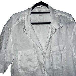 This H&M button down shirt in crisp white offers a timeless and versatile style, perfect for any occasion. Crafted from lightweight fabric, it ensures comfort and breathability throughout the day. Its classic design makes it a staple piece for any wardrobe.