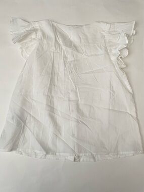 Lightweight white blouse with front buttons. Short ruffle sleeves add a feminine touch. Square neckline for a relaxed look. Easy to pair with jeans or skirts.