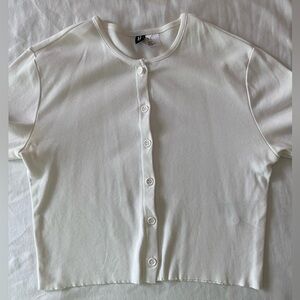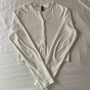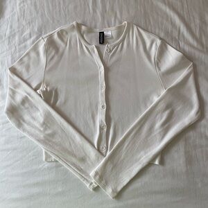 Elegant white cardigan. Button-up front. Soft and comfortable fabric. Perfect for layering.