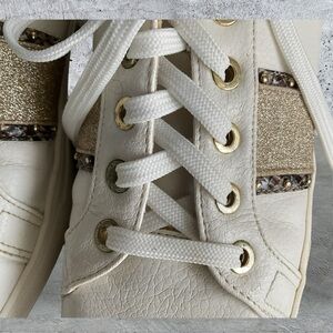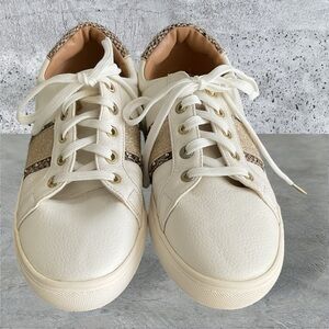 H&H White sneaker with snakeskin & gold side accent, faux leather, Size 8. (Note photos for peelings)