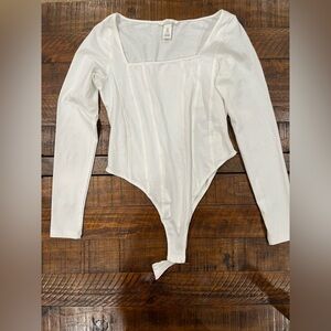 Elegant white bodysuit with long sleeves. Features a square neckline. Perfect for layering or wearing alone.