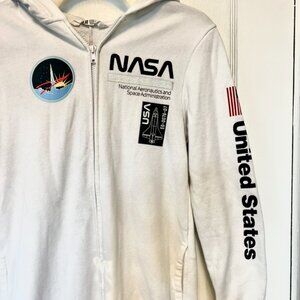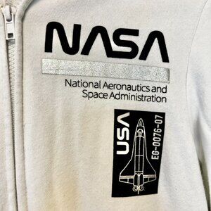 Cozy white H&M jumpsuit for loungewear, pajamas, dress-up, or Halloween. Long zipper front with 100% cotton lined hood and pockets. NASA decor on front and sleeve. Perfect for your future astronaut! Machine washable. Shell is 80% cotton, 20% polyester.
