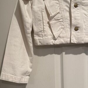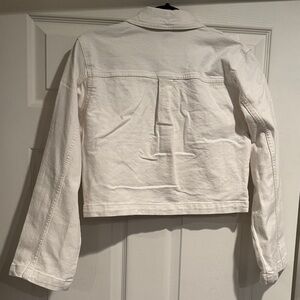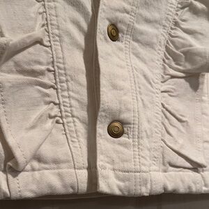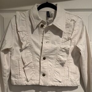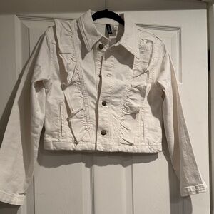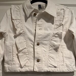 Stylish white jean jacket. Features unique ruffle design. Button-up front. Perfect for casual wear.