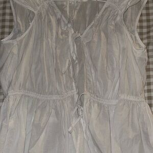 Chic white blouse with ruffle details. Sleeveless design. Perfect for layering.