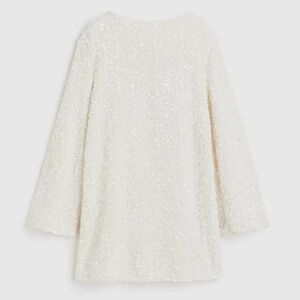Short, A-line dress in soft velour covered in shiny sequins. Round neckline, long sleeves and a deep V-neckline at the back with a wide grosgrain ribbon that ties at the back of the neck. Jersey lining.