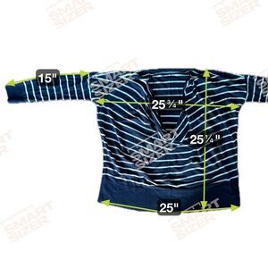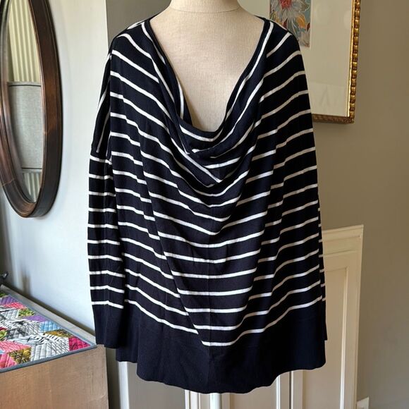 This white and blue crew neck sweater features a classic nautical-inspired stripe pattern with alternating navy blue and white stripes. The wide draped cowl neckline creates an elegant drape effect, while the relaxed fit ensures comfort for everyday wear. In great pre-owned condition.
