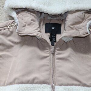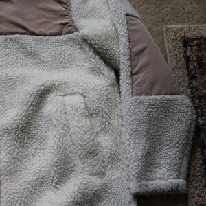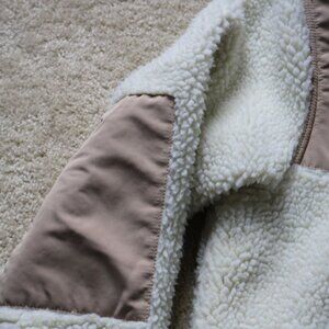 Warm sherpa puffer with hood. White body and brown accents. Zipper front closure.