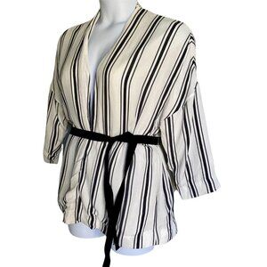 H&M White and Grey Striped Wrap Top Black Tie Belt Womens Small