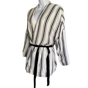 H & M Lined White and Grey Striped Wrap Top with Black Tie Belt. 100% Rayon. Womens Size Small with Approximate measurements laying flat: length 29", Sleeve Length 12", pit to pit 18".