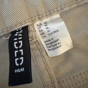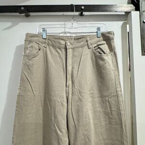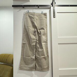 Minimalist high-rise and wide-leg pants in a neutral stone color.