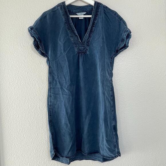 H&M Women Blue Denim Shift Dress Chambray Short Sleeve V-Neck Tunic Girly Size 4