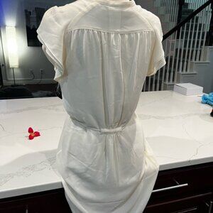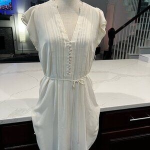 Elegant cream dress with button-front design. Features a flattering tie waist.