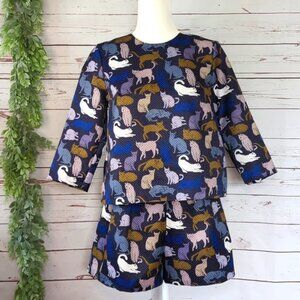 H&M Women's 12 Blue Cat Kitty Novelty Pleated Print High Waist Shorts Cat Lady