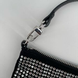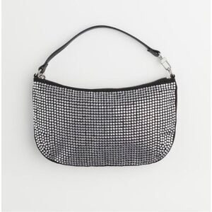 Rhinestone-embellished bag in imitation leather with a zip at the top. Short, narrow strap with a carabiner hook at one end so that it can be used either as a normal strap or a wrist strap by fastening the two ends with the carabiner hook. Lined.
