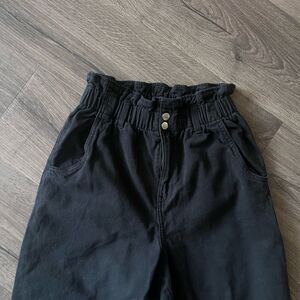 Stylish black high-waisted pants. Features a button closure. Perfect for casual wear.