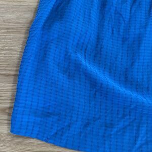 Tie at the shoulder, flowy tank top, elastic at the chest, blue colorway.