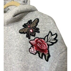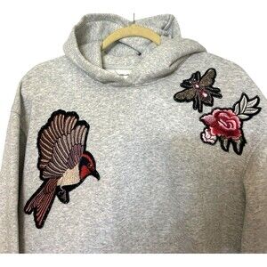 H&M Womens Hoodie Sweatshirt Rhinestone Embroidered Bird Floral Butterfly Patches Gray Long Sleeve Fleece Kangaroo Pocket