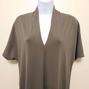 H&M Womens Khaki Olive Green Pullover Dolman Sleeve Short Sleeve Knee-Length Midi Shift Tunic Loose Fit Dress, Low Stand-Up Collar with V-Neck, Side Slits at Hemline, Unlined, Slinky Jersey Material with Some Stretch, Comfy and Versatile, Dress Up or Down, The Perfect Layering Piece for Every Season