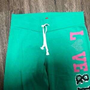 H&M, women's, juniors, petite, sweatpants, joggers, lounge pants, green, graphic, love, hope, heart, rhinestone, casual, comfortable, sporty, streetwear, athletic, cotton blend, pre-owned