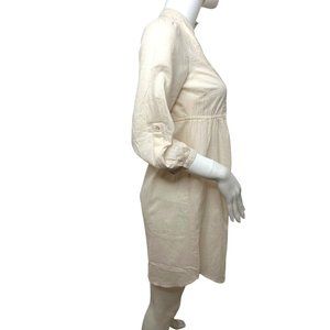 0047B- H&M women’s mini dress, size 2, pale peach, made in India, 100% cotton, lightweight, sheer, three-quarter sleeves with roll tab option. Full button down, band collar, V-neck. Pleated bodice, slightly puffed sleeves, elastic waist, Rounded Hemline.