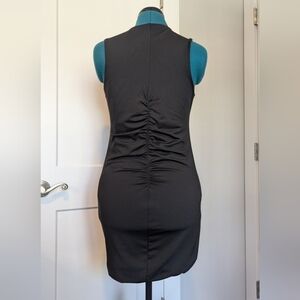 H&M women's black minidress. Thick fabric that is fully lined, so you don't have to worry about what is (or isn't) underneath. Ruching gives this sheath dress a flattering fit. Small slits / openings in the neckline add a little extra spice to this super sleek and sexy dress!
