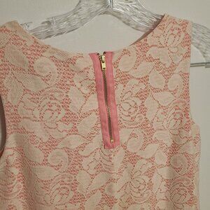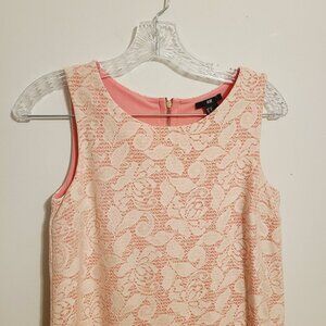 Women's pink and white lace sleeveless mini dress by H&M, size XS. Dress can be dressed up with a blazer or dressed down with a cardigan. Also, it may be worn as a tunic top. There are so many options! Fabric blend of polyester and viscose. Dress is lined with an exposed gold zipper in the back. Excellent pre-owned condition; no flaws.