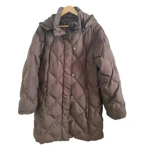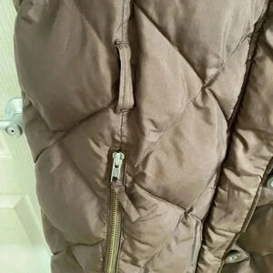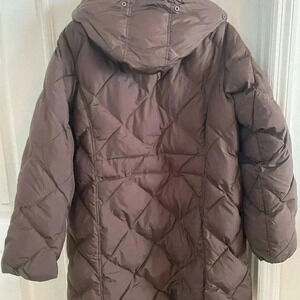 H&M Womens Size 16 Brown Long puffer Winter Snow Jacket Knee Length Hood. This jacket is pre-owned. Good condition. No flaws. Missing a belt. Measurements: 22.5 inch chest 23 inch waist 37 inch length 26 inch arm length