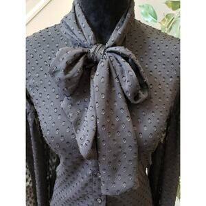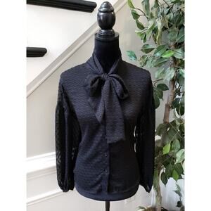 H&M Women's Size 2 Black Sheer Dot Button Blouse Bow Neck Long Sleeve Top