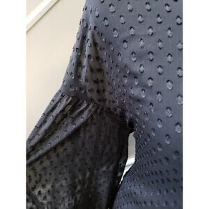 Chic and lightweight, this H&M women’s blouse in US size 2 features a sheer black polka dot design with a feminine bow neck and button-down front. Made of 100% polyester, it’s perfect for layering or wearing on its own. Elegant and trendy for office or evening wear.
